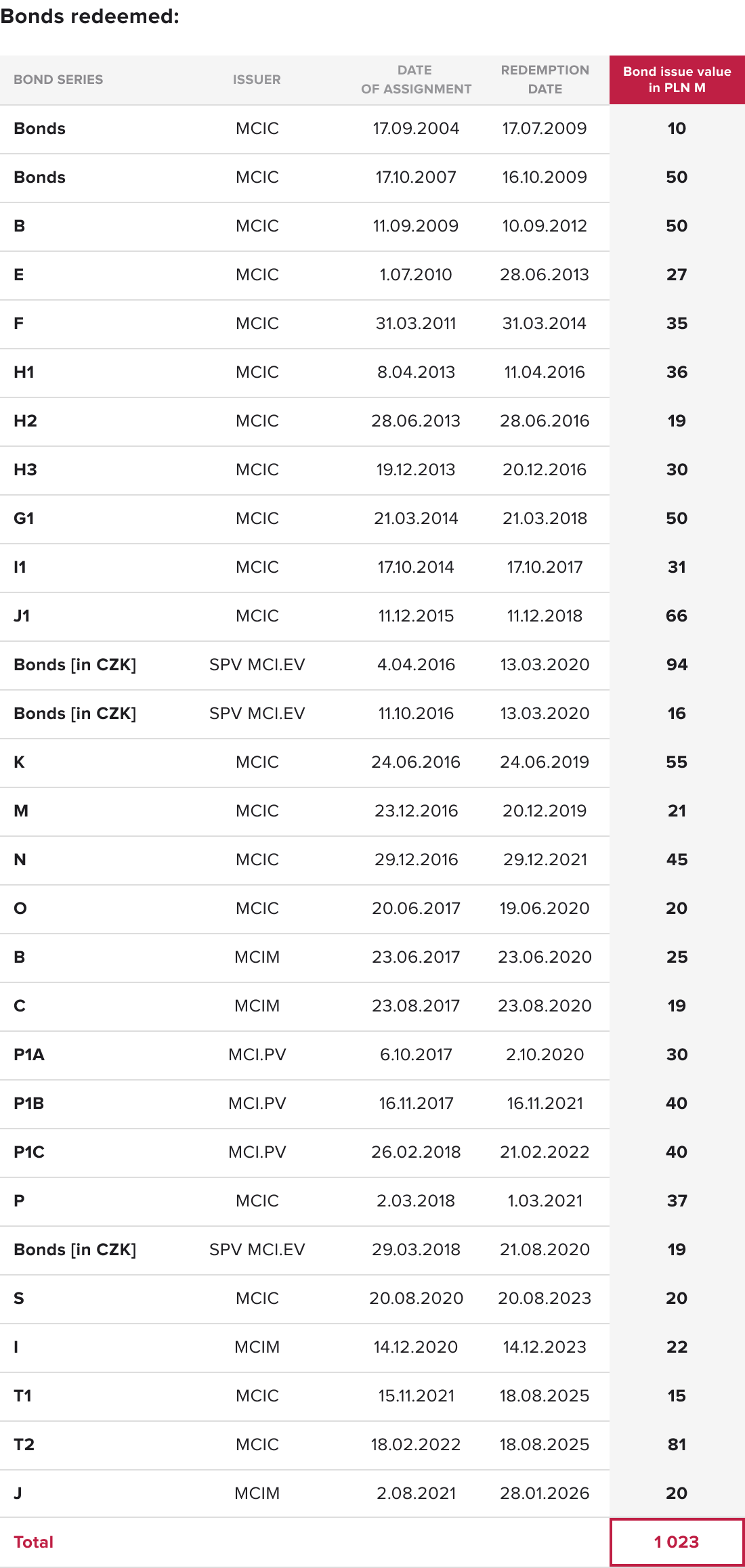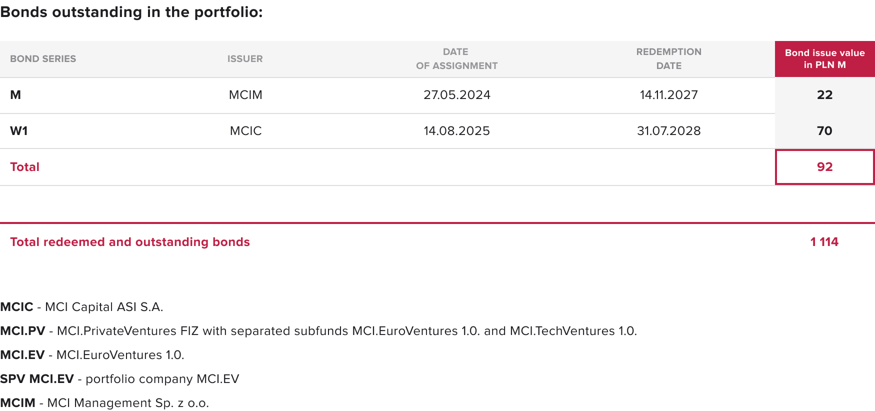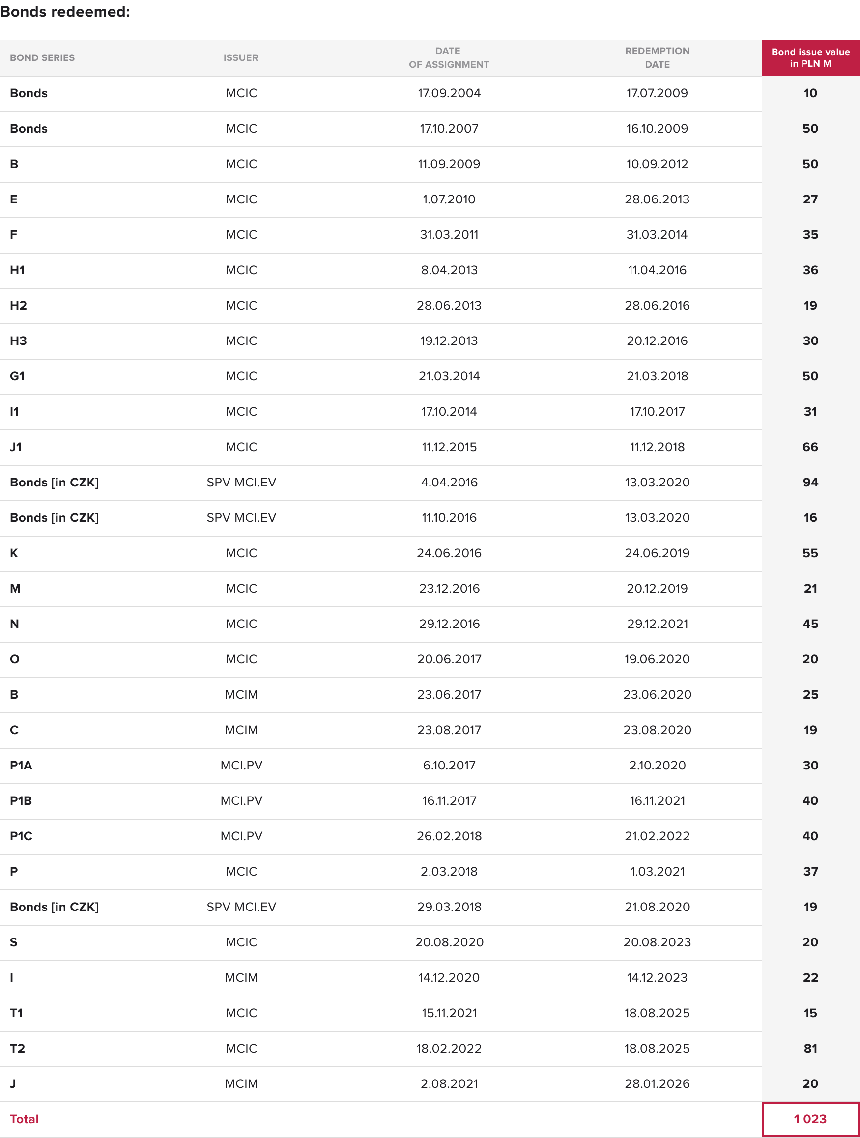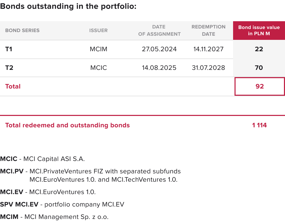 since the beginning of its operations, the MCI Group has issued bonds to institutional and retail investors with a total nominal value of PLN 1,114 million, of which PLN 1,023 million was redeemed on or before maturity, and PLN 92 million is currently in the Group’s portfolio.