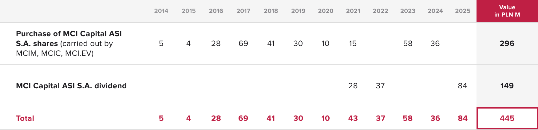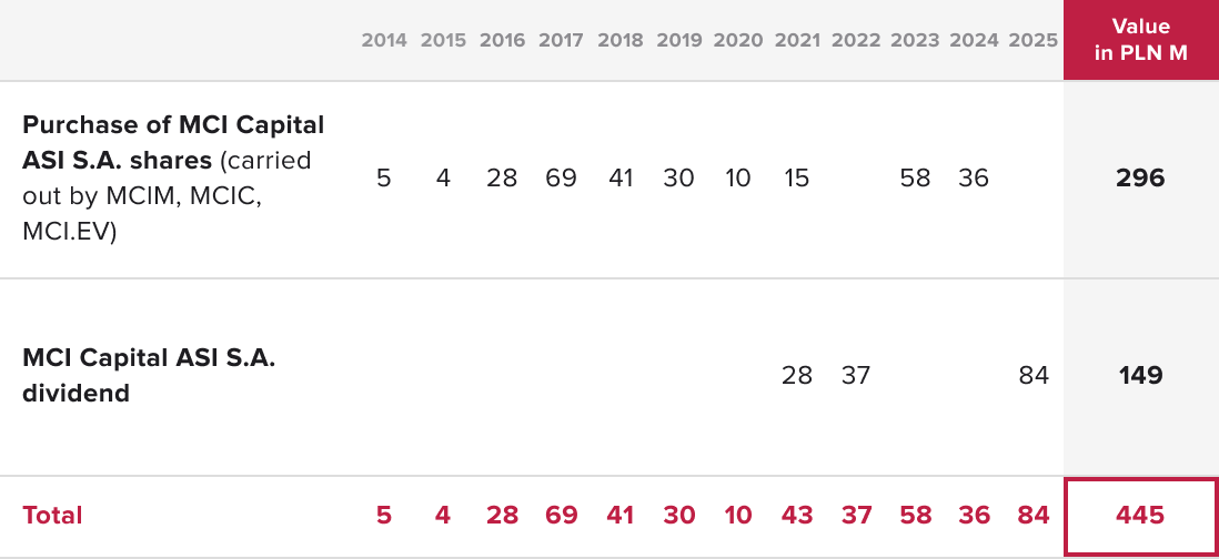Since 2014 the MCI Group has paid out PLN 445 million to shareholders, including: