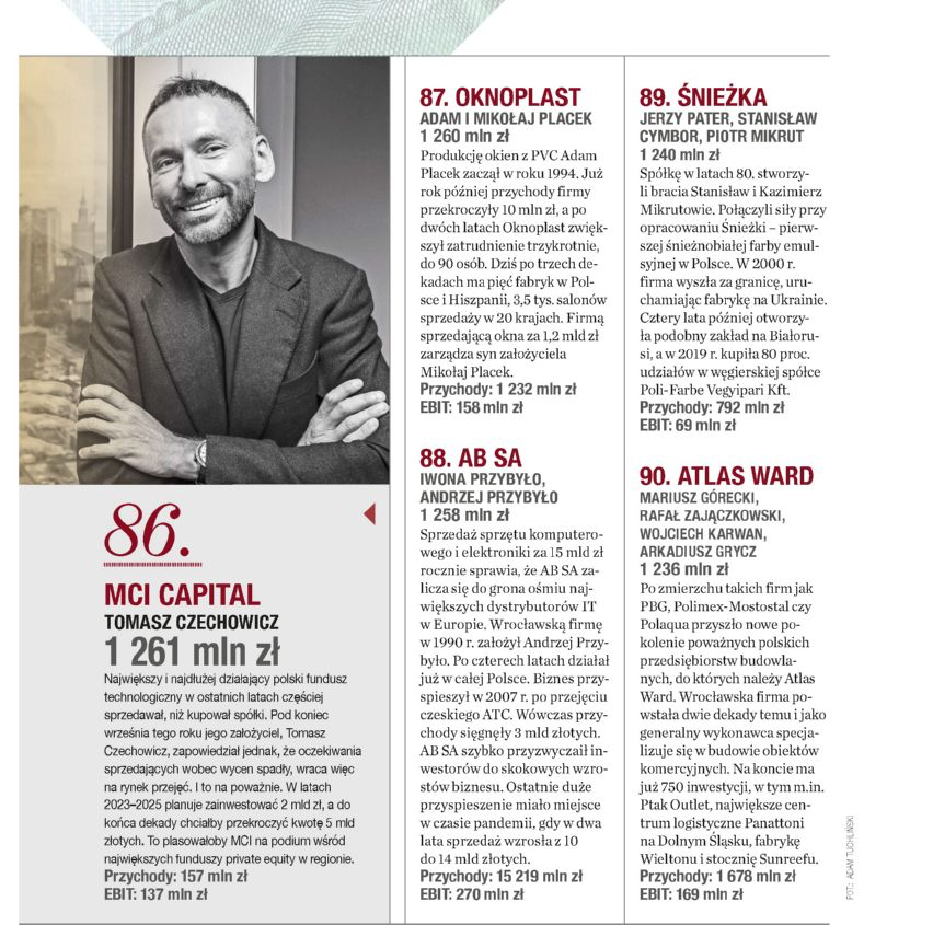 MCI Capital, kontrolowany przez Tomasza Czechowicza, znalazł się w gronie 100 największych polskich firm prywatnych w rankingu przygotowanym przez Forbes Polska. „W latach 2023–2025 MCI planuje zainwestować 2 miliardy złotych, a do końca dekady chciałoby przekroczyć kwotę 5 miliardów złotych. To stawiałoby MCI na podium wśród największych funduszy private equity w branży regionu” – czytamy w „Forbesie”.