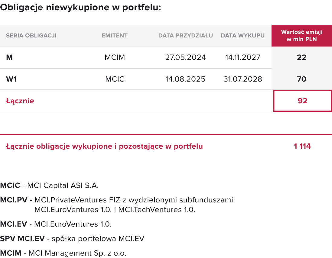 Od początku działalności Grupa MCI wyemitowała obligacje skierowane do inwestorów instytucjonalnych jak również detalicznych o łącznej wartości nominalnej 1.114 mln PLN, z czego 1.023 mln PLN zostało wykupionych w terminie lub przed terminem zapadalności, a 92 mln PLN znajduje się obecnie w portfelu Grupy.