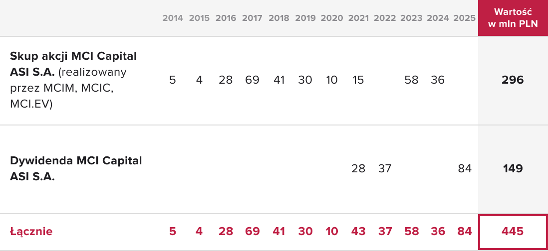 Od 2014 r. Grupa MCI wypłaciła akcjonariuszom 445 mln PLN, w tym:
